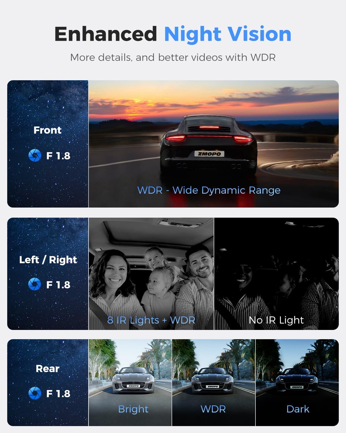 - QUALITY NIGHT VISION & WDR TECHNOLOGY - This dash cam features advanced night vision and Wide Dynamic Range (WDR) technology for exceptional image quality in all lighting conditions. It has 8 infrared lights to ensure clear recordings even in low light. WDR automatically adjusts exposure and contrast to capture balanced images in challenging lighting conditions.